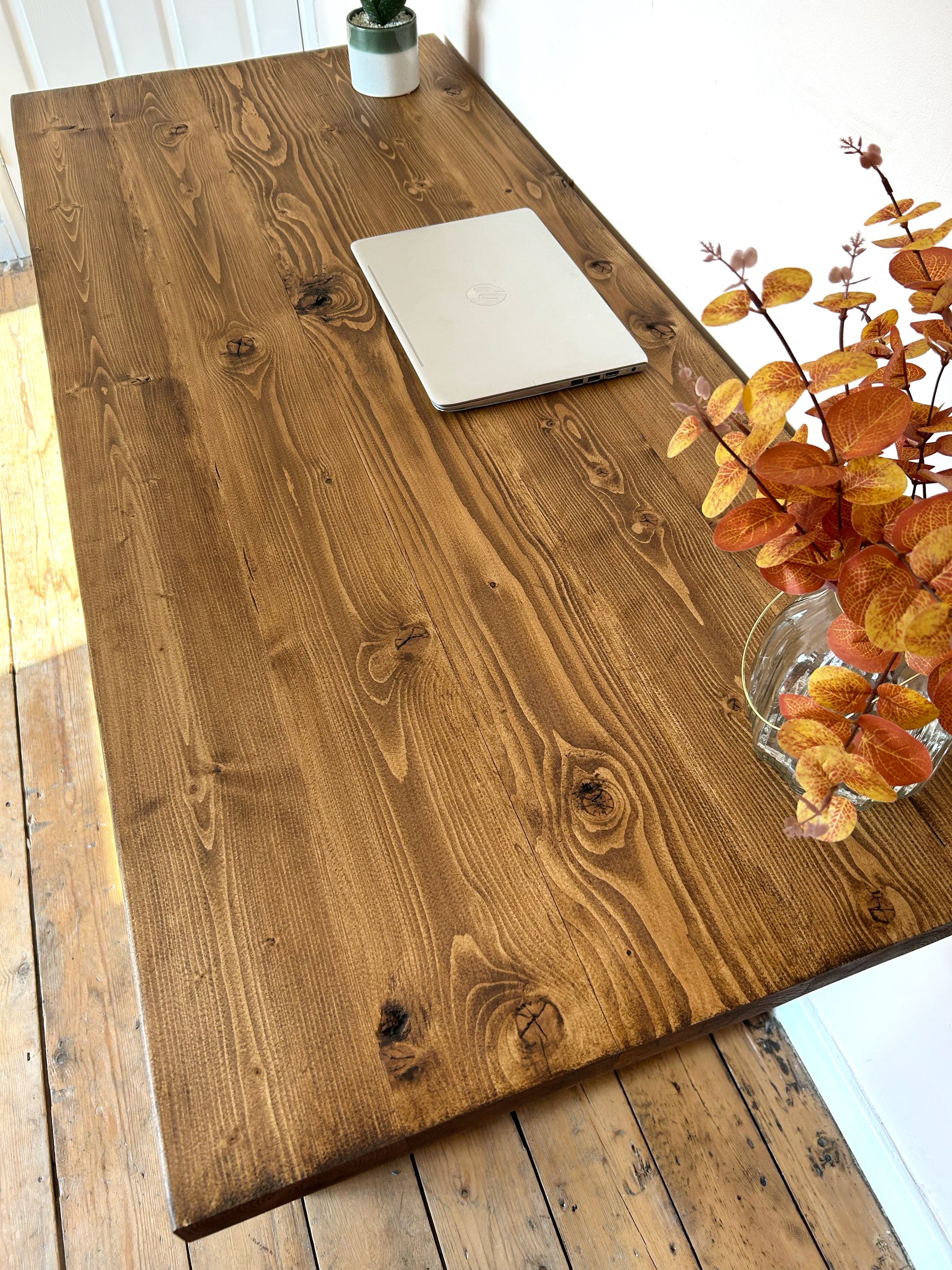 Each desk is handmade to order in our UK workshop using FSC-certified Redwood Pine - a durable, high-grade timber chosen for its strength and natural beauty. We use clean, kiln-dried solid pine, professionally prepared to give a smoother, more refined finish while still retaining its natural character. Unlike reclaimed scaffold boards, it offers consistent quality, a cleaner look, and long-term stability indoors.