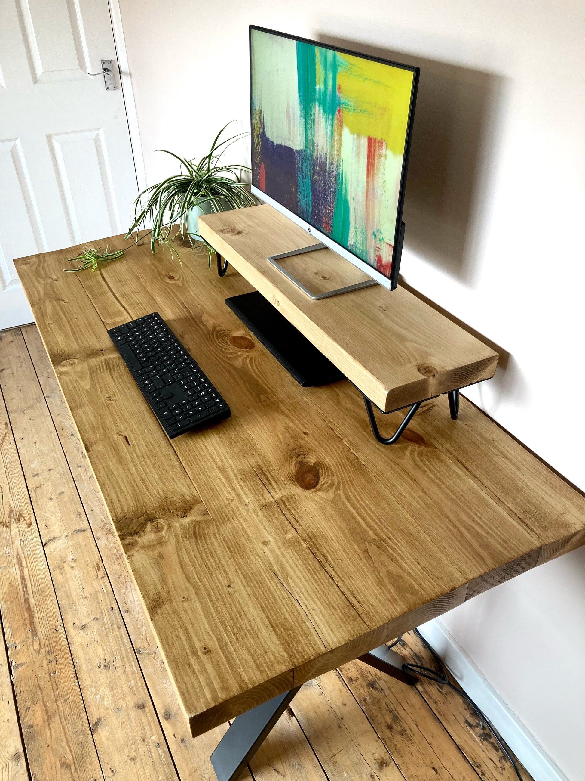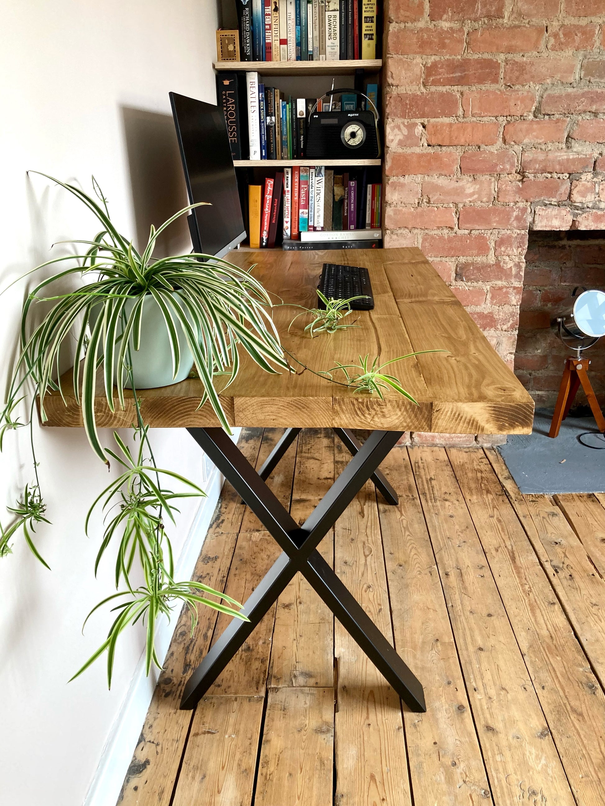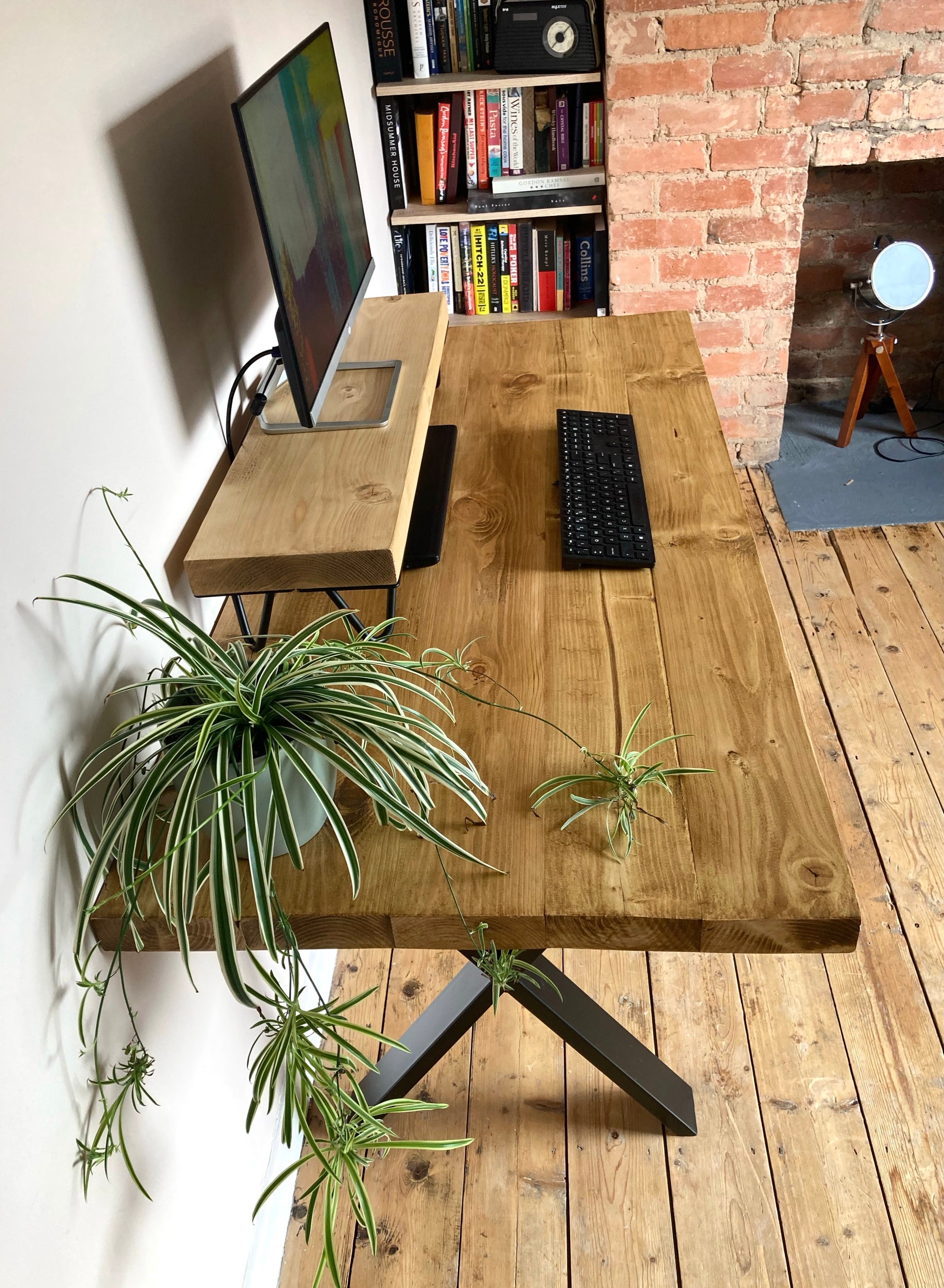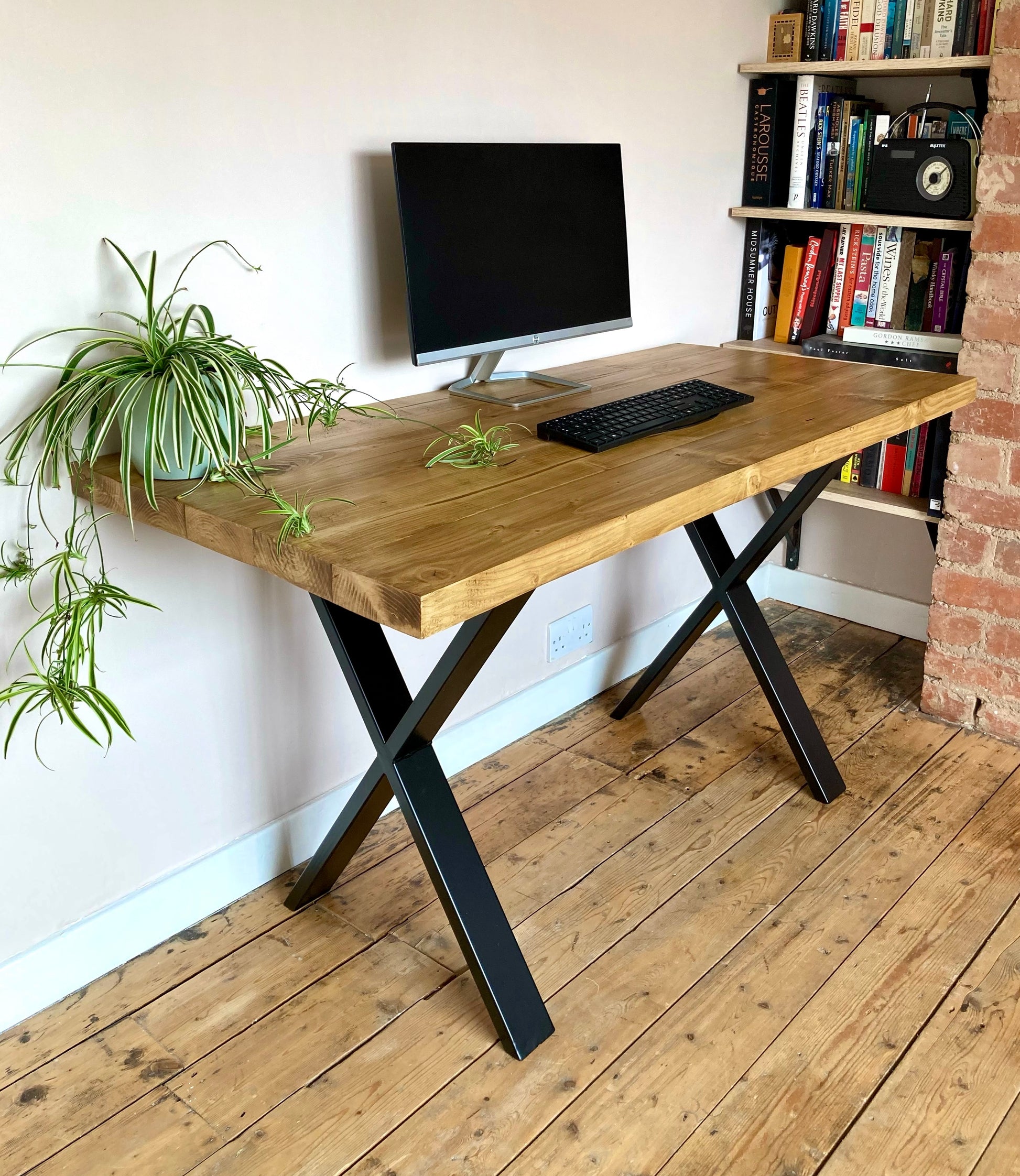 Each desk is handmade to order in our UK workshop using FSC-certified Redwood Pine - a durable, high-grade timber chosen for its strength and natural beauty. We use clean, kiln-dried solid pine, professionally prepared to give a smoother, more refined finish while still retaining its natural character. Unlike reclaimed scaffold boards, it offers consistent quality, a cleaner look, and long-term stability indoors.